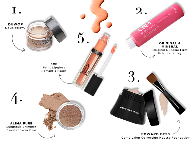 Get the look: Use Edward Bess’s innovative Complexion Correction Mousse Foundation, which has a super awesome, soufflé-like (and weightless) texture to achieve the veneer of naturally flawless skin. Swipe a little Alima Pure Luminous Shimmer Eyeshadow in Chai over your eyelids and dab 3CE Paint Lip Gloss in Romantic Peach on your lips. For that rested-yet-ready glow, apply a thin layer of DuWop Doubleglow 7 on top of your makeup.